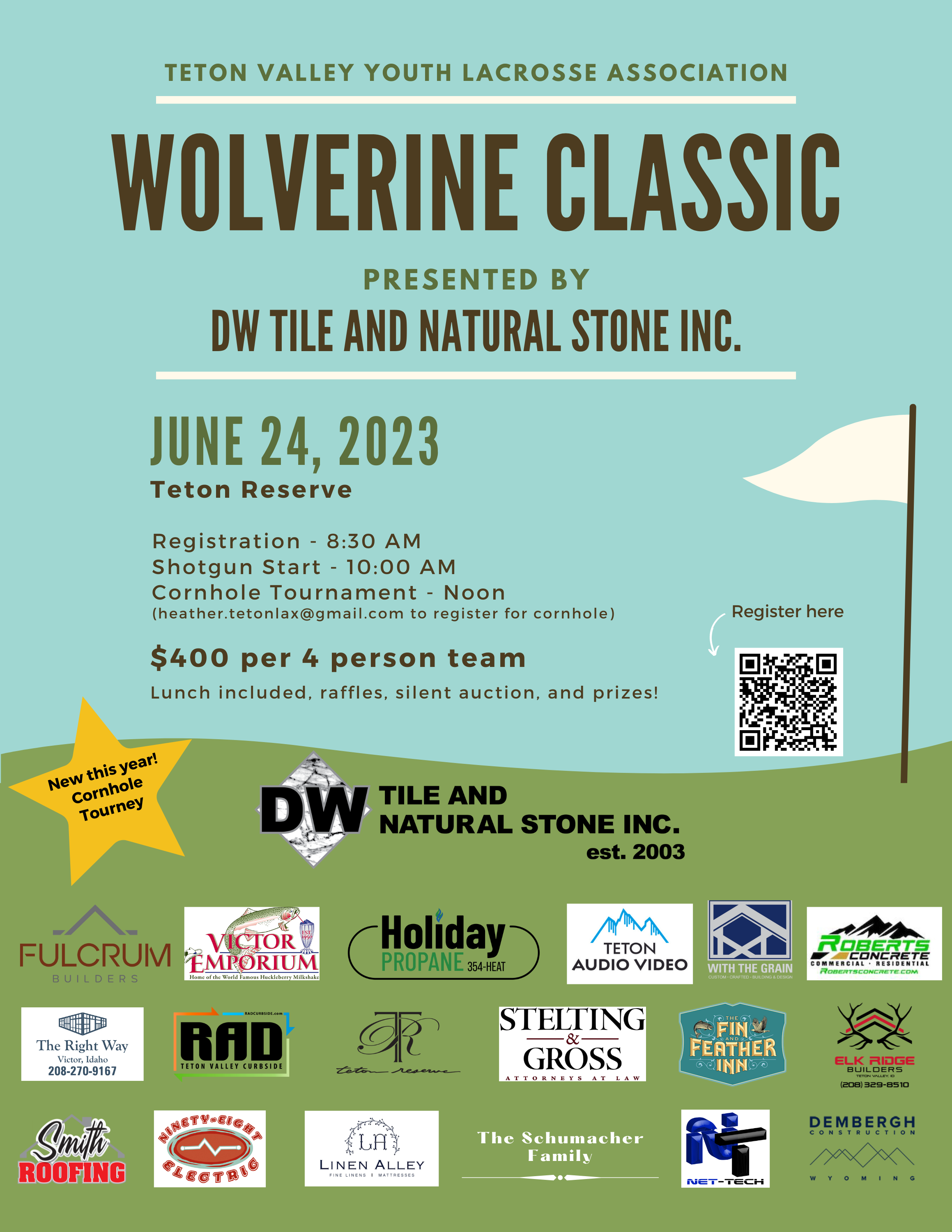It’s going to be double elimination play, so find your perfect cornhole partner and sign up to play. $40 per team or $50 the day of the event. Email heather.tetonlax@gmail to get signed up