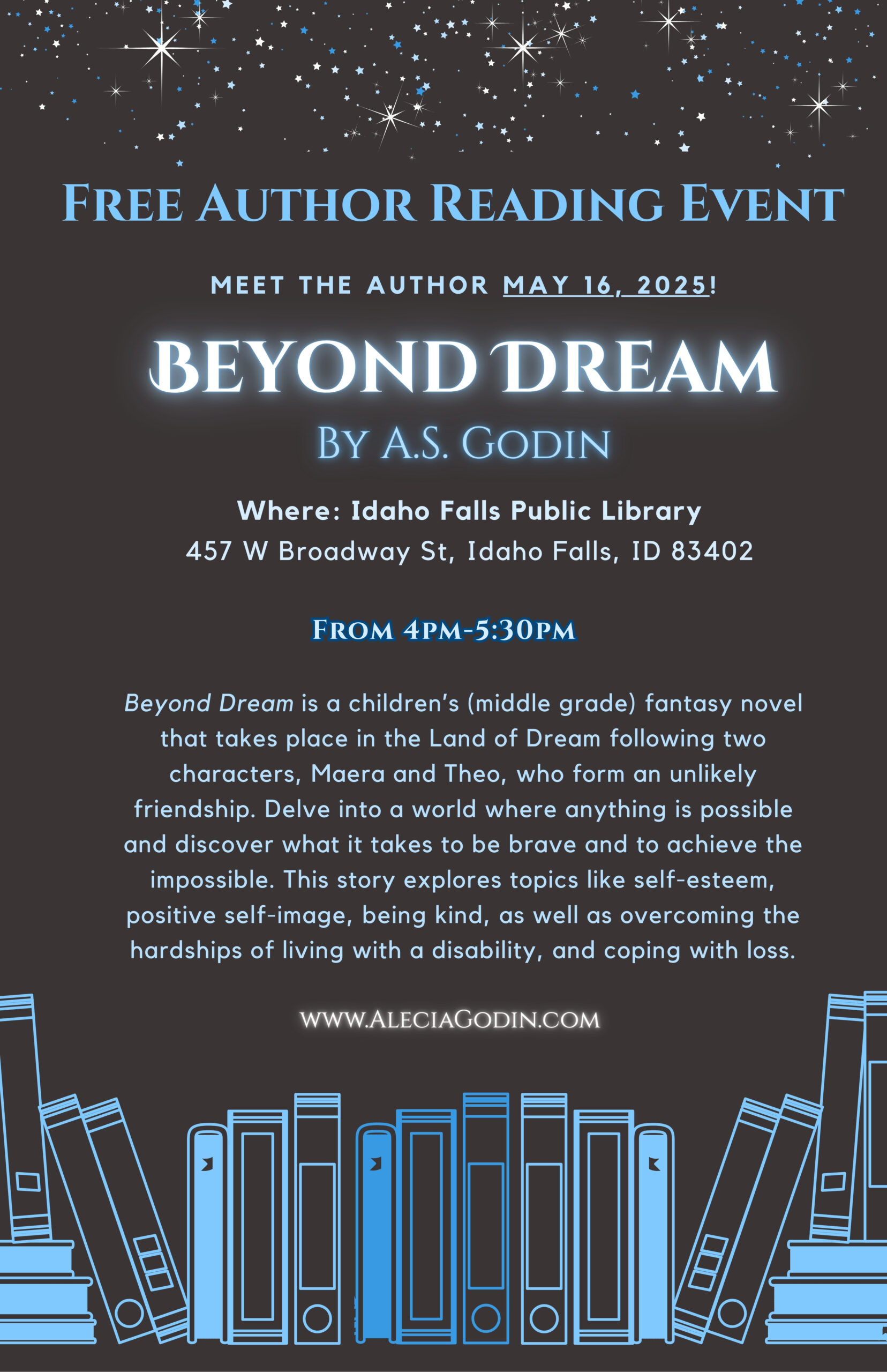 Children’s Author, A.S. Godin will appear Friday, May 16th 2025 4pm-5:30pm to do a reading from her published book, Beyond Dream.