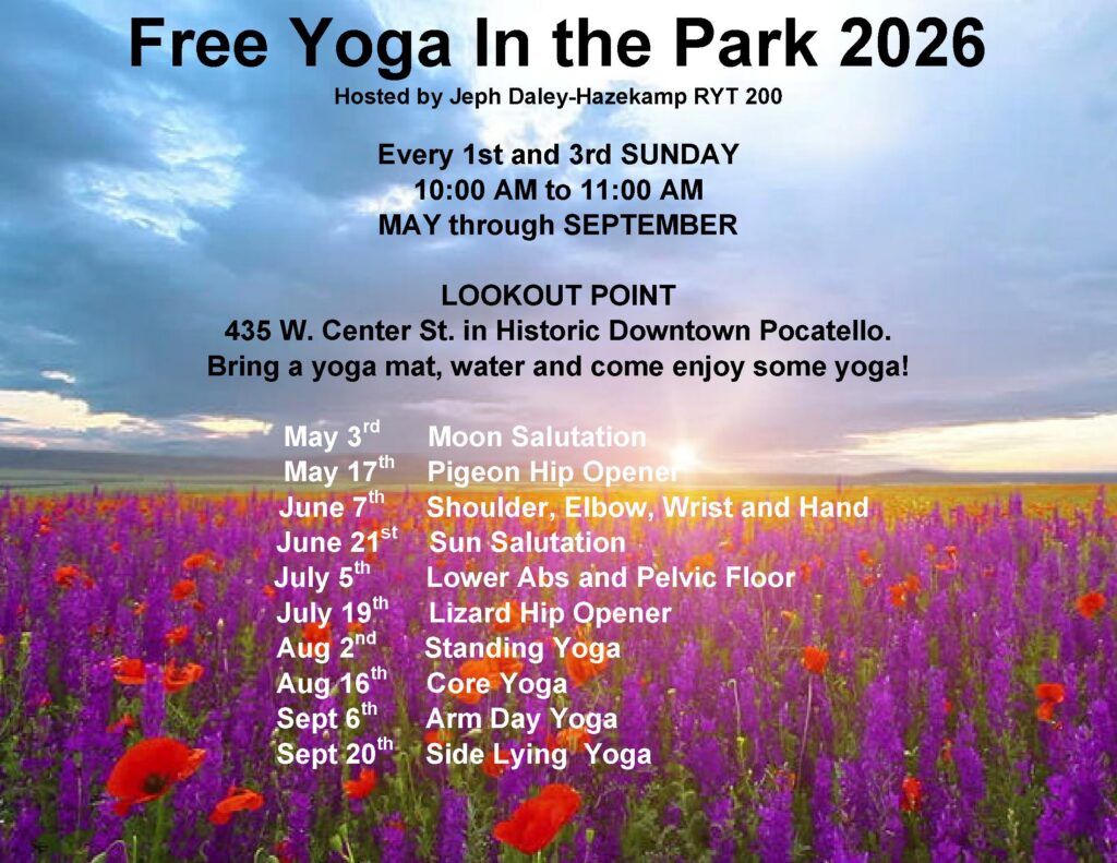 Free Yoga Every 1st and 3rd Sunday May through September. Lookout Point In Historic Downtown Pocatello. 435 W Center St.