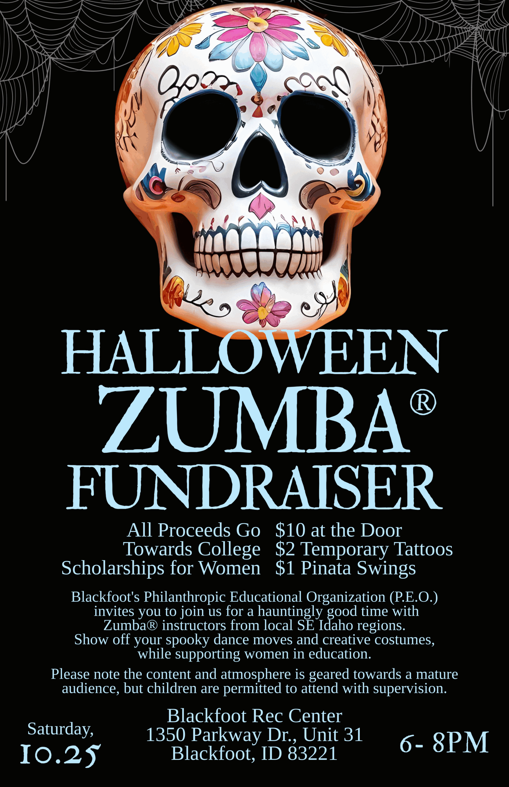 Blackfoot’s Philanthropic Educational Organization (P.E.O.) invites you to join us for a hauntingly good time with Zumba® instructors from local South East Idaho regions. Show off your spooky dance moves and creative costumes, while supporting women in education.