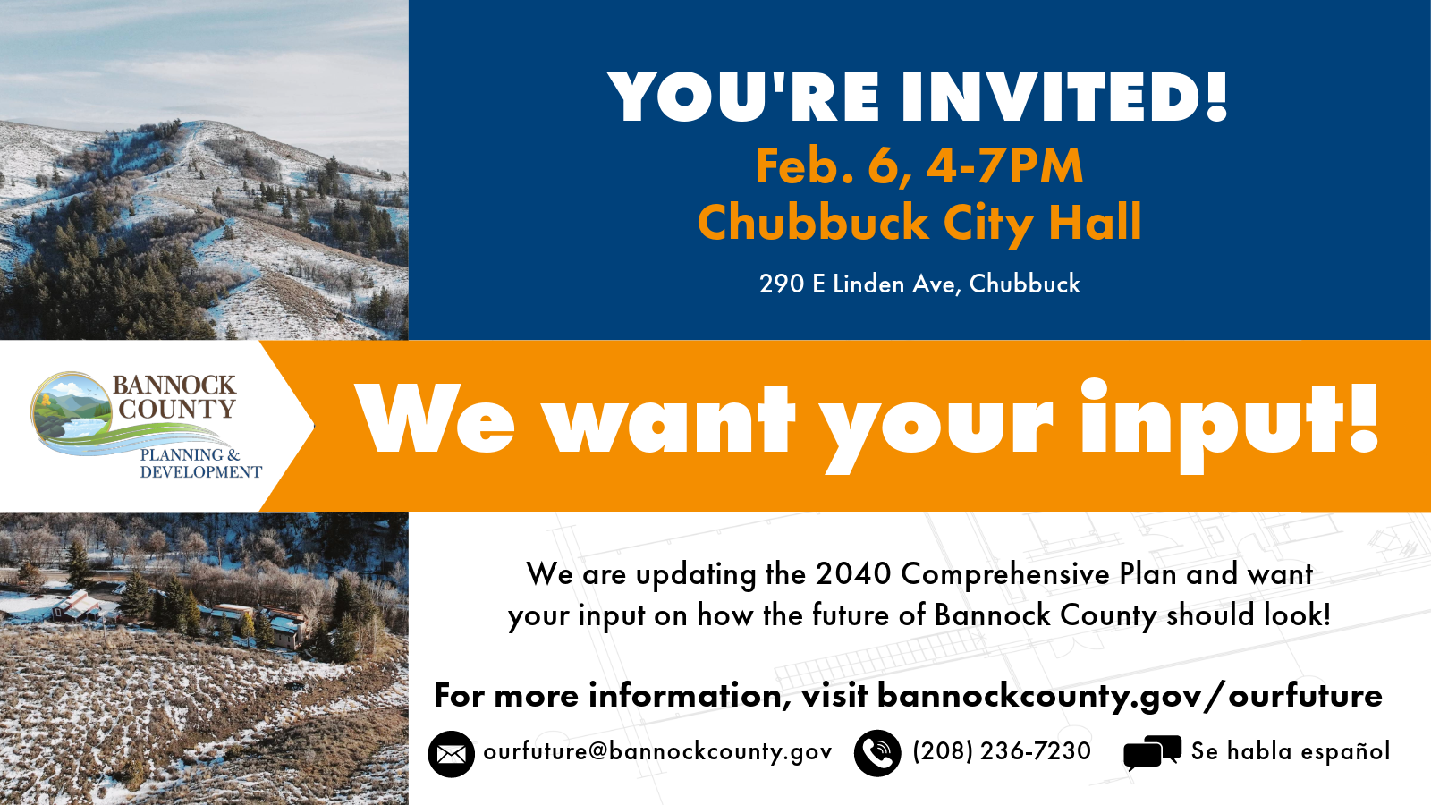 We are updating the 2040 Comprehensive Plan and want your input on how the future of Bannock County should look! Join us at one of our open houses to share your thoughts.