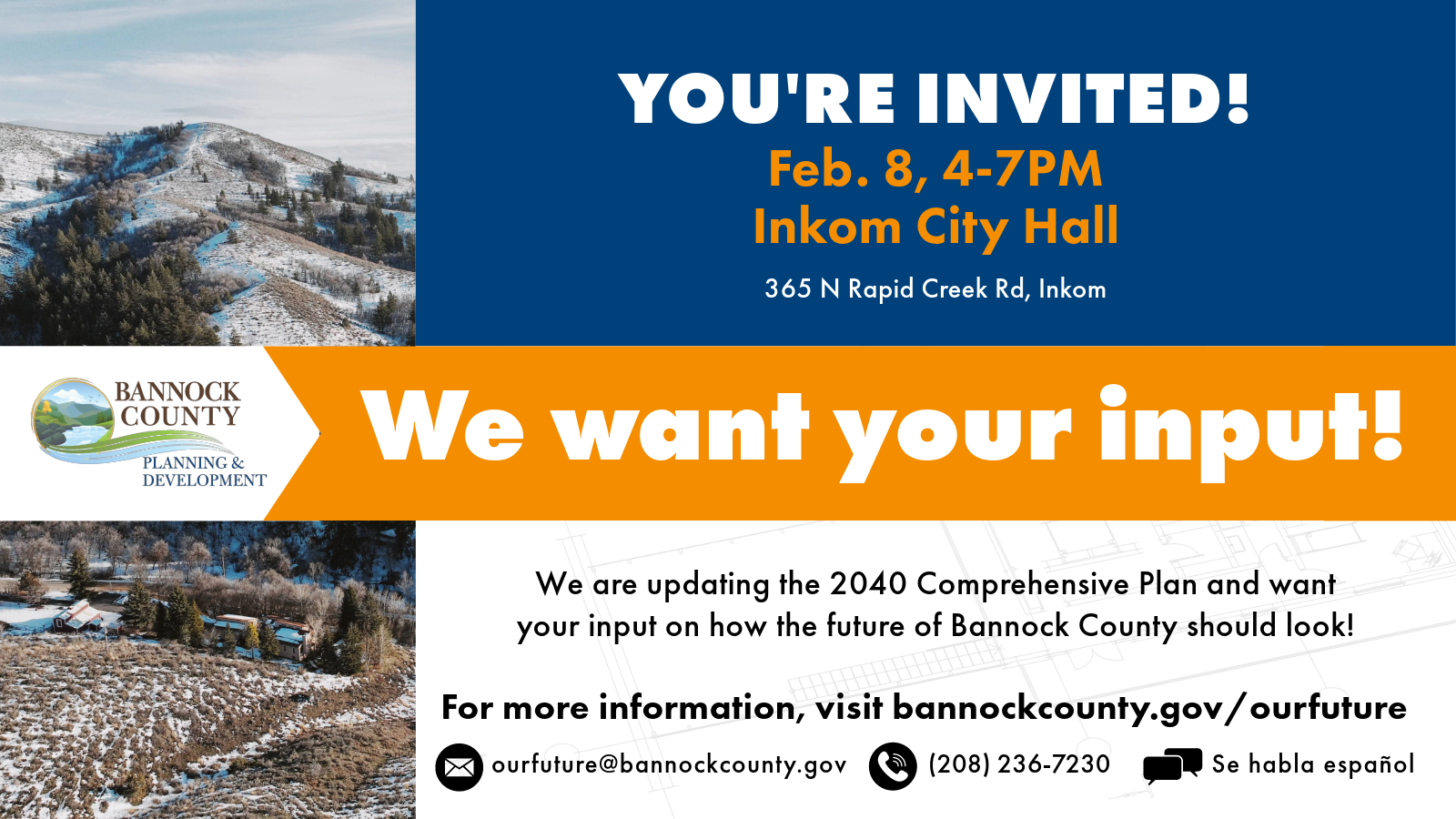 We are updating the 2040 Comprehensive Plan and want your input on how the future of Bannock County should look! Join us at one of our open houses to share your thoughts.